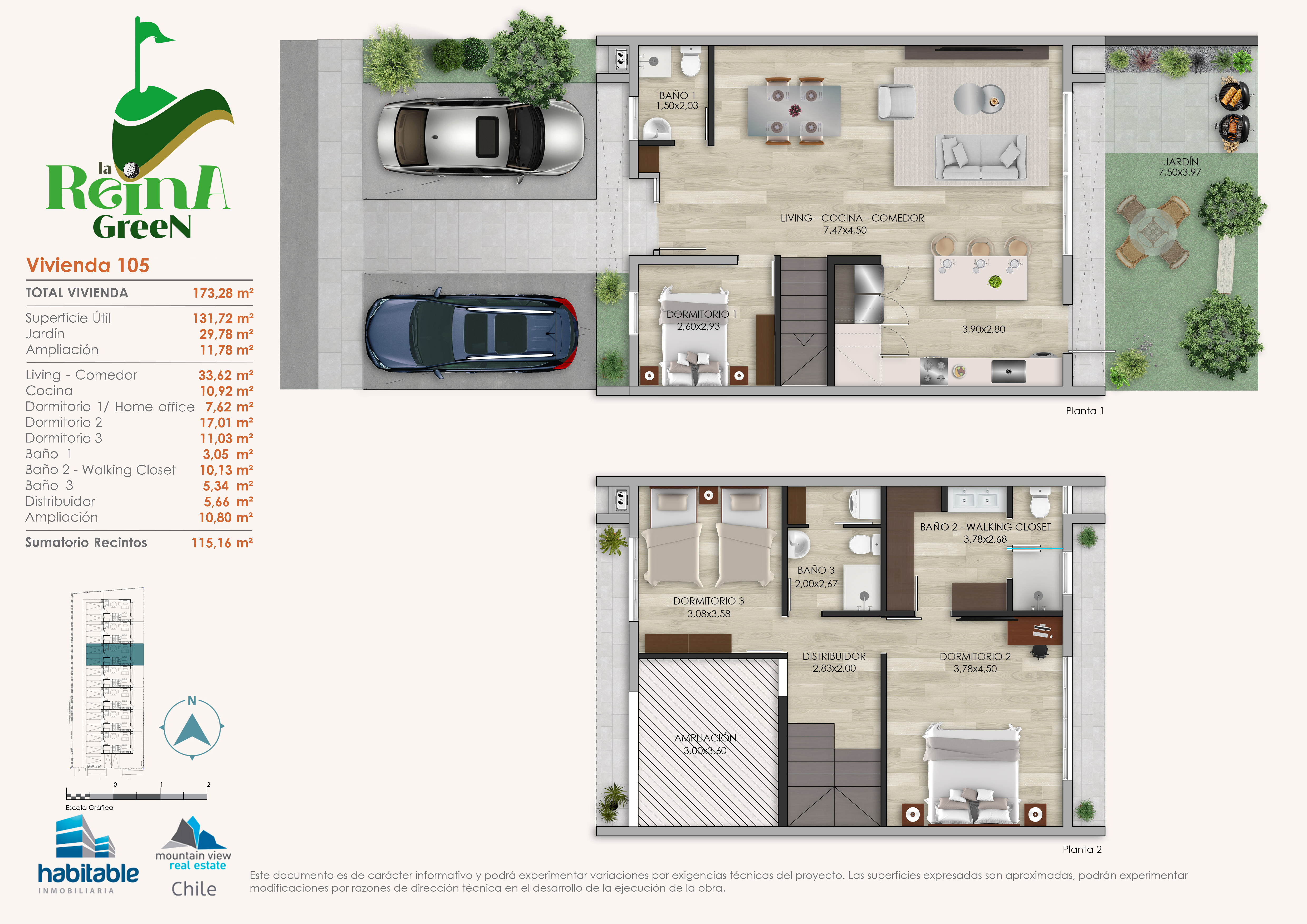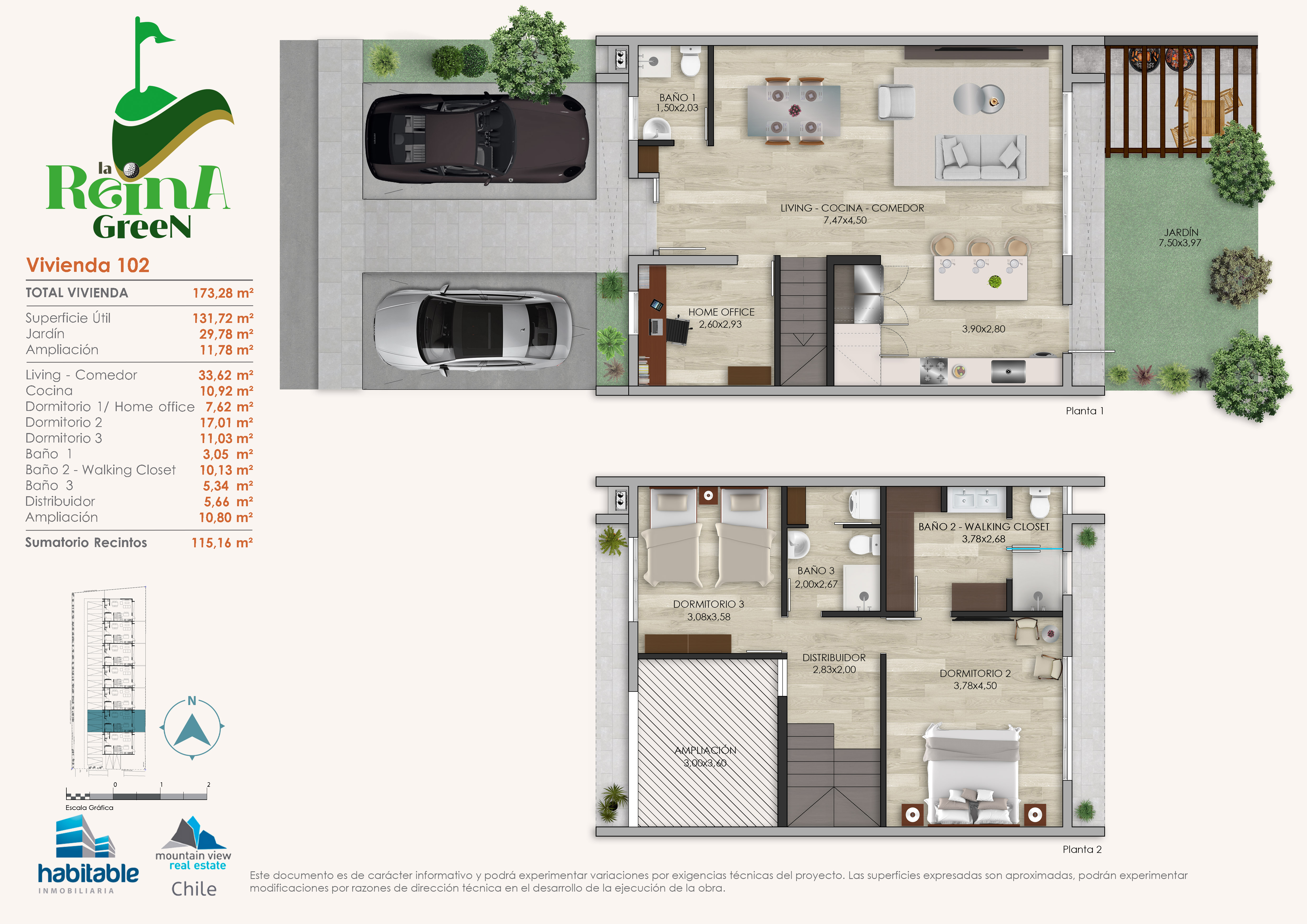 En la Reina Green podrás encontrar casas con la privacidad que tu buscas, junto con poseer una excelente distribución de sus espacios. Las unidades cuentan con una capacidad de tres habitaciones con la posibilidad de ampliación a cuarta habitación. Disponen también de un amplio jardín privado y una excelente vista cordillerana.